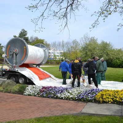 Danach fährt das Deichmobil los und der Deich rollt sich selbsttätig ab.