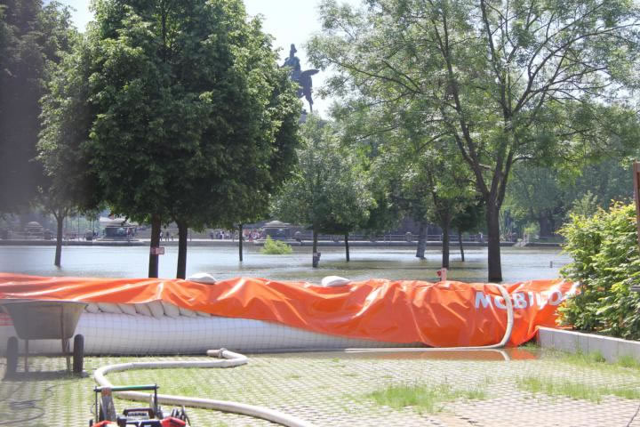 Da MOBILDEICH 2er Module hohe Sicherheits-Reserven haben, kann eine Erhöhung um bis zu 30% des Schlauchdurchmessers auch mit Kanthölzern, Brettern oder anderen leichten Gegenständen stattfinden, die auf den landseitigen Schlauch unter die Plane gelegt werden.