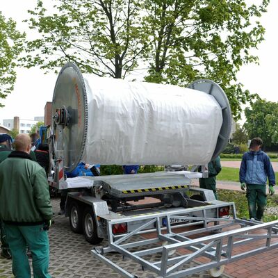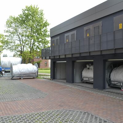 40m Deich mit 2,6m Höhe werden auf einer Trommel gelagert.