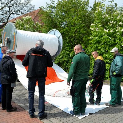 Danach fährt das Deichmobil los und der Deich rollt sich selbsttätig ab.