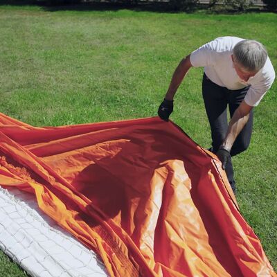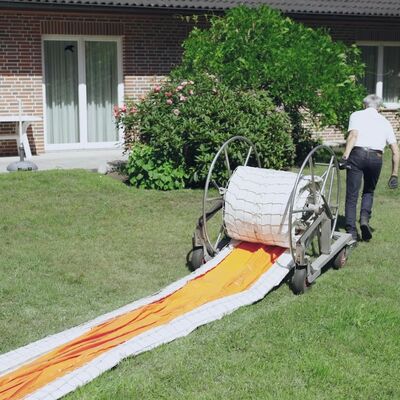 Unsere Dichtungsplane wird nach dem Ausrollen des Schlauch-Moduls und bereits während des Befüllens ausgebreitet